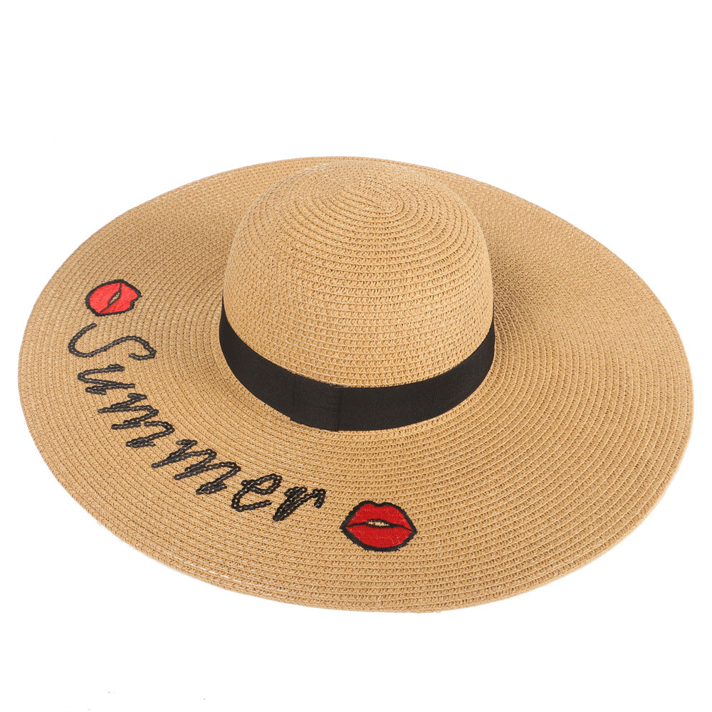 VE24 LAS OREIRO CAPELINA RAFIA BEIGE C/BORDADO SUMMER Y LAZO NEGRO