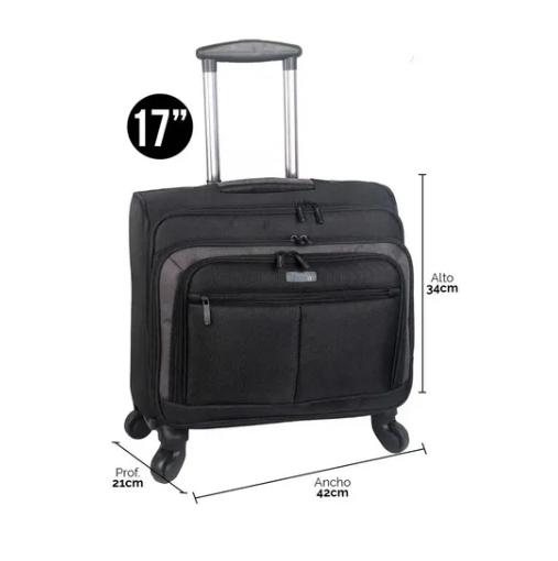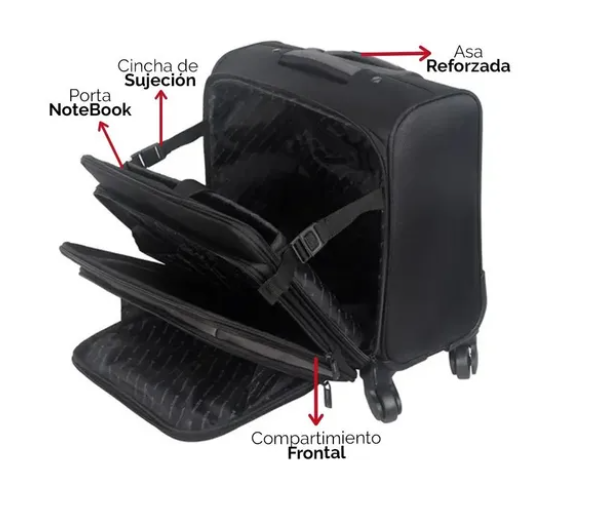Porta notebook con carro Travel Tech. Mobile Office con 4 ruedas con doble bolsillo. Presenta un compartimiento principal con apertura completa y cintas de ajuste para regular dicha apertura. Interior forrado con un compartimiento tipo sobre, acolchonado para almacenar una notebook. Cintas de ajuste para contener las pertenencias.